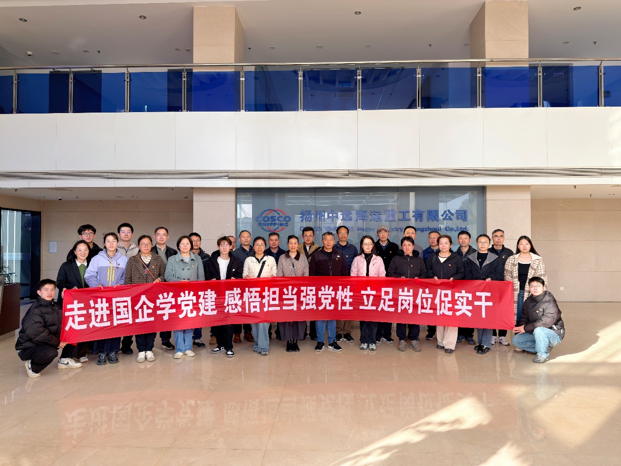 28日下午,师生党员一行首先抵达扬州中远海运重工。在企业相关负责人的带领下,大家深入生产车间,近距离参观了船舶建造流程、核心技术应用及智能化生产设备,详细了解企业在海洋工程装备制造、绿色船舶研发等领域的创新成果与发展历程。企业党建负责人分享了中远海运重工以党建引领企业高质量发展的实践经验,介绍了党员先锋岗、技术攻坚突击队在关键岗位上攻坚克难的先进事迹。师生党员们纷纷表示,从企业的发展成就和党员职工的奋斗故事中,深刻感受到了“大国重器”背后的责任担当,更体会到了党建工作与业务深度融合的强大生命力。
