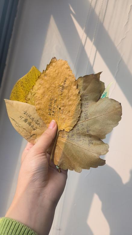活动期间,同学们走出教室,在校园的林荫道、草坪间细心寻觅心仪的落叶——有的叶脉清晰、形态完整,有的色彩斑斓、带着秋末冬初的独特韵味。大家充分发挥创意与想象,以笔墨为媒,在叶面上尽情挥洒:或书写当下的心情感悟,记录青春里的小确幸;或摘录喜爱的诗词名句,传递对生活的热爱;或设计个性创意文案,展现年轻一代的奇思妙想。部分同学还巧妙运用彩笔、贴纸等工具点缀装饰,让每一片落叶都成为独一无二的艺术作品。