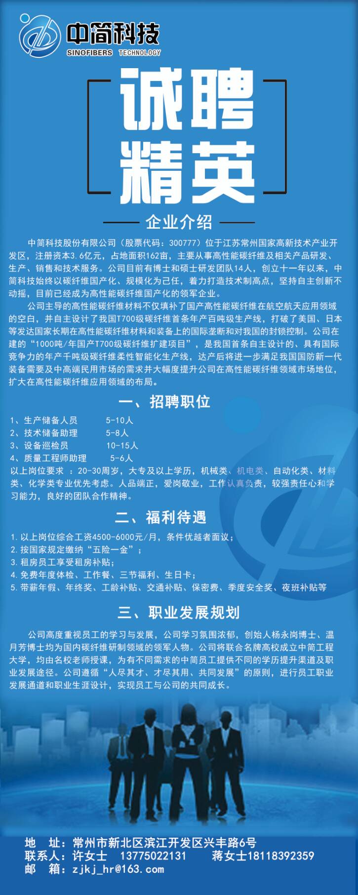 中简科技股份有限公司(股票代码: 300777) 位于江苏常州国家高新技术产业开发区,注册资本3. 6亿元,占地面积162亩,主要从事高性能碳纤维及相关产品研发、生产、销售和技术服务。公司目前有博士和硕士研发团队14人,创立十一年以来,中简科技始终以碳纤维国产化、规模化为己任,着力打造技术制高点,坚持自主创新不动摇,目前已经成为高性能碳纤维国产化的领军企业。 公司主导的高性能碳纤维材料不仅填补了国产高性能碳纤维在航空航天应用领域的空白,并自主设计了我国T700级碳纤维首条年产百吨级生产线,打破了美国、日本等发达国家长期在高性能碳纤维材料和装备上的国际垄断和对我国的封锁控制。公司在建的“1000吨/年国产T700级碳纤维扩建项目”,是我国首条自主设计的、具有国际竞争力的年产千吨级碳纤维柔性智能化生产线,达产后将进-步满足我国国防新一代装备需要及中高端民用市场的需求并大幅度提升公司在高性能碳纤维领域市场地位,扩大在高性能碳纤维应用领域的布局。一、招聘职位