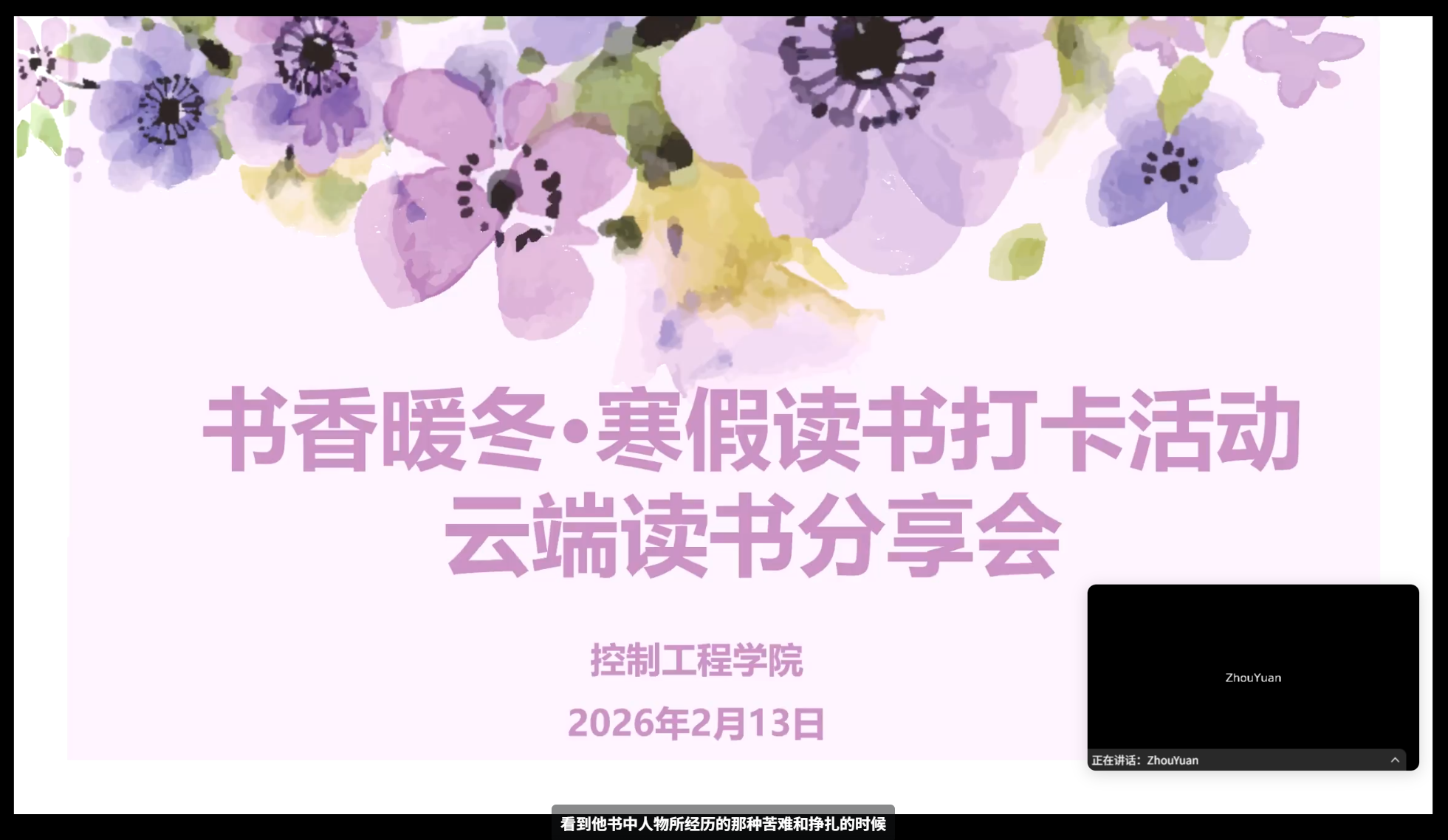 为深化资助育人实效,丰富学生寒假生活,营造浓厚读书氛围,引导学生在阅读中增长学识、涵养品格,控制工程学院近期举办“书香暖冬”寒假读书云端分享会。学院党总支副书记周嫄出席活动,学院学生资助工作负责人朱娟娟主持会议,多位同学围绕寒假阅读打卡成果分享感悟,全体参会同学在交流中碰撞思想、共话成长。