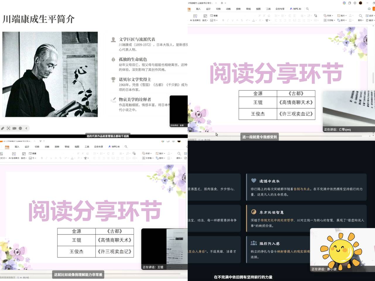 书籍分享环节,同学们依次交流感悟、共享书香。金源解读《古都》的创作背景与人文内涵,王坤分享《高情商聊天术》的沟通技巧,王俊杰讲述《许三观卖血记》中的温情与力量,廖小波推介《凡人修仙传》的世界观与处世智慧,喻将畅谈《活着》对生命意义的深刻思考,多元的书籍与真挚的感悟,展现出学子广泛的阅读视野。